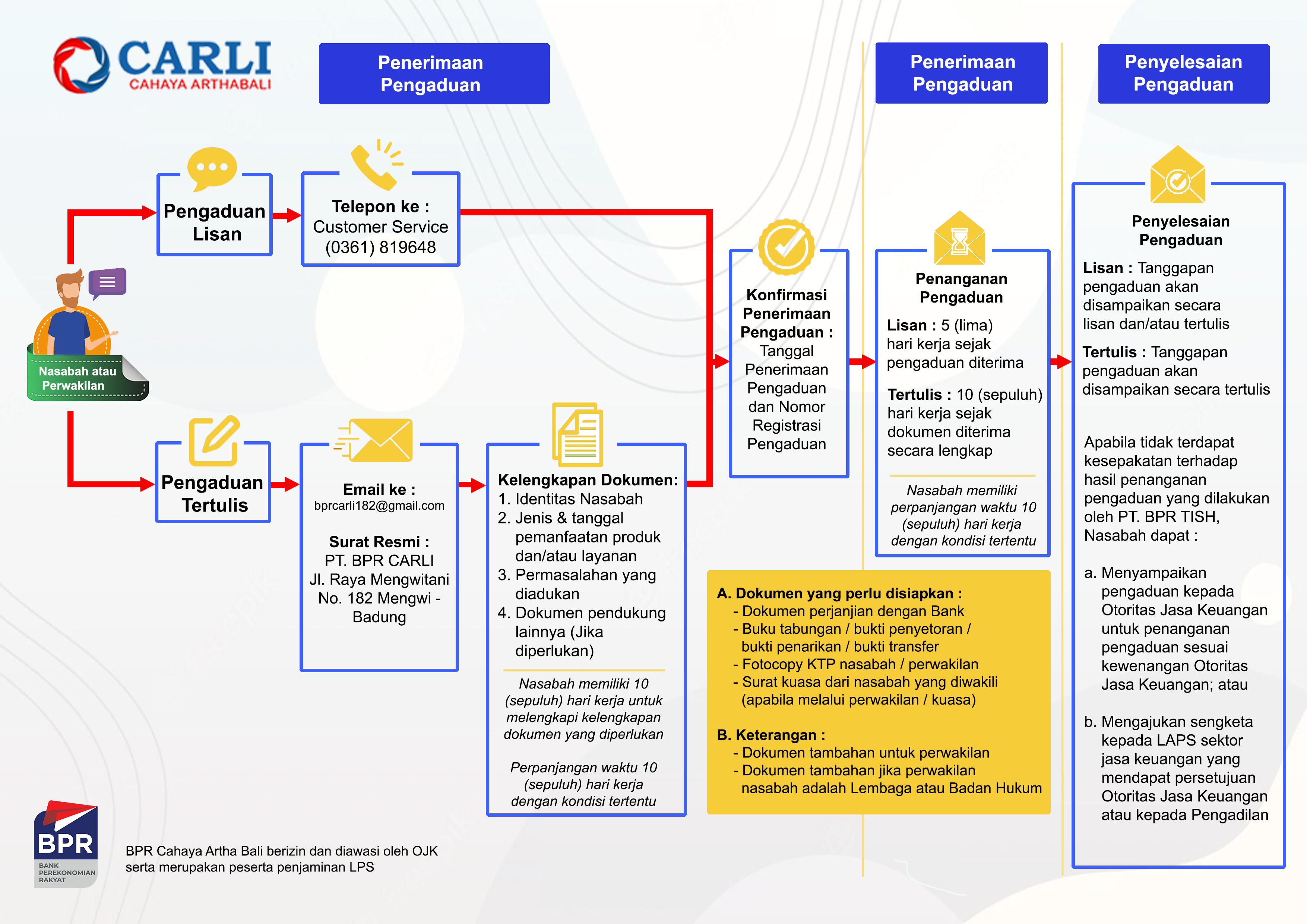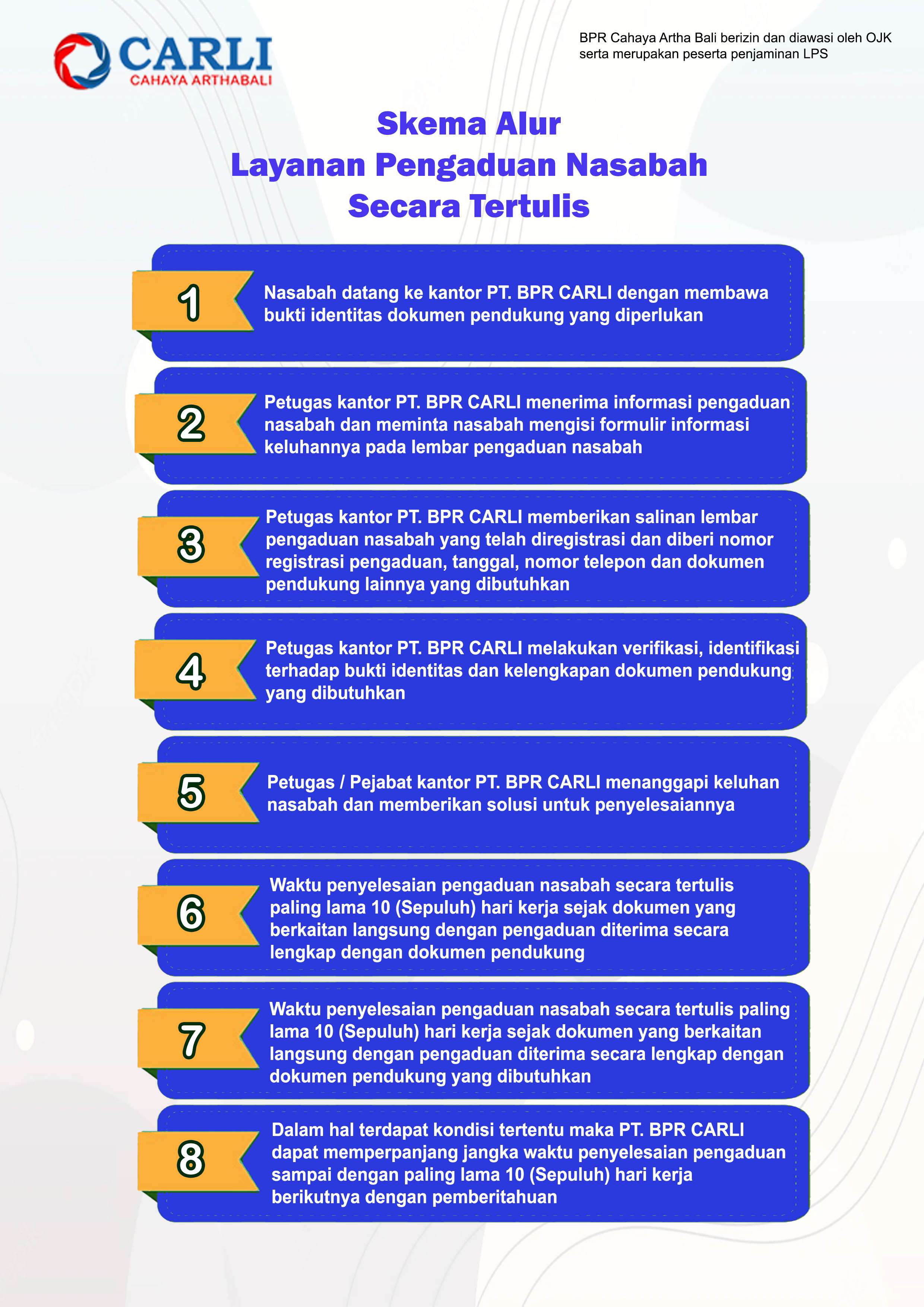 - Pengaduan secara tertulis dapat disampaikan melalui surat atau email ke alamat bprcarli182@gmail.com dengan judul (subyek) "Pengaduan Nasabah"
